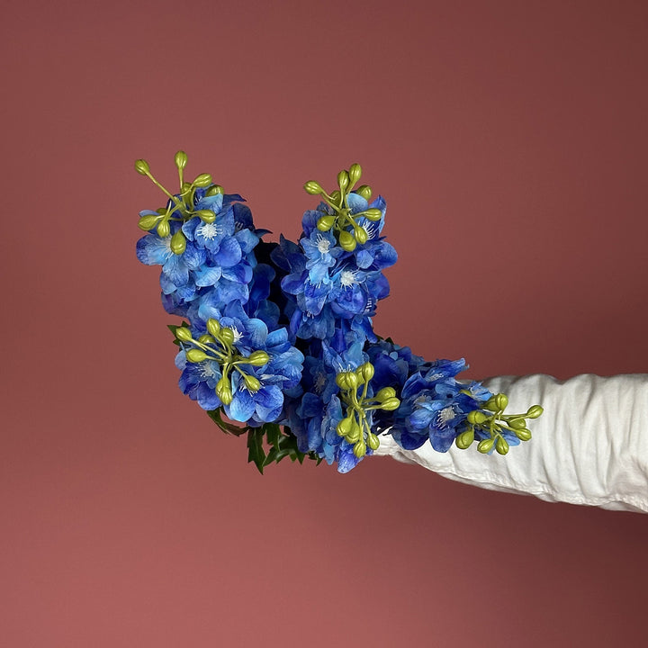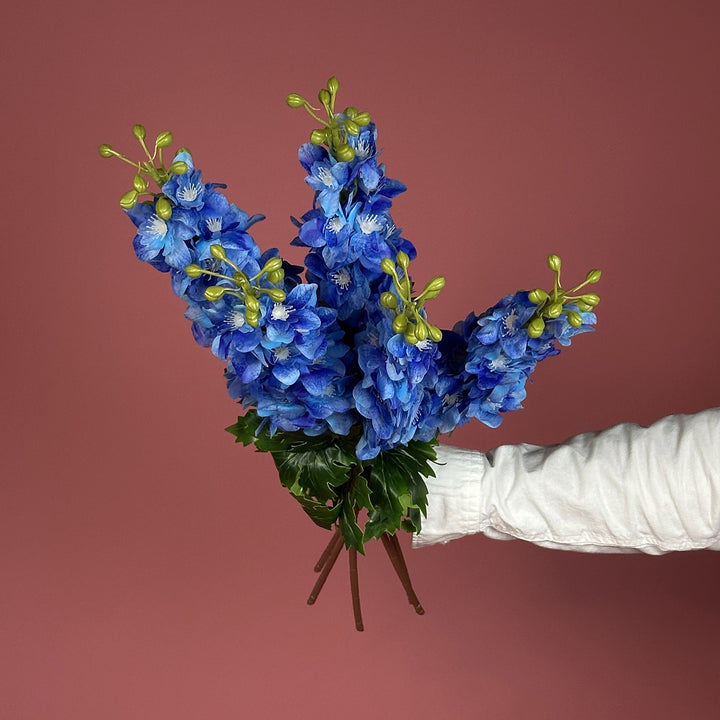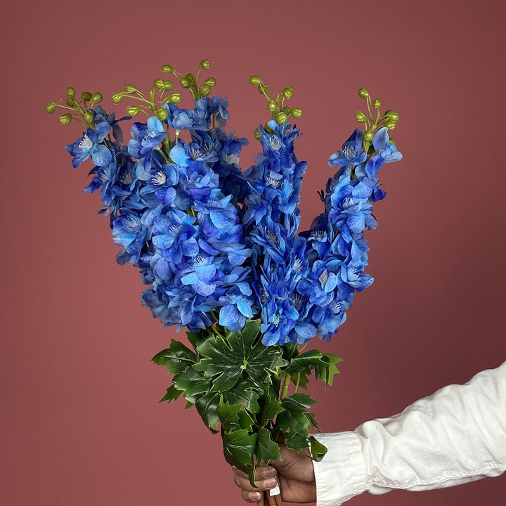 Artificial Real Touch Blue Delphinium is a lifelike artificial stem sculpted with tall spires of real‑touch petals in rich cobalt blue, capturing the stately elegance of delphiniums in bloom. Each flower showcases subtle shading and fine veining, while the flexible wired stem allows you to arch graceful curves or shape upright columns with ease.