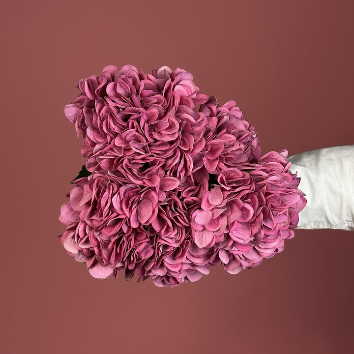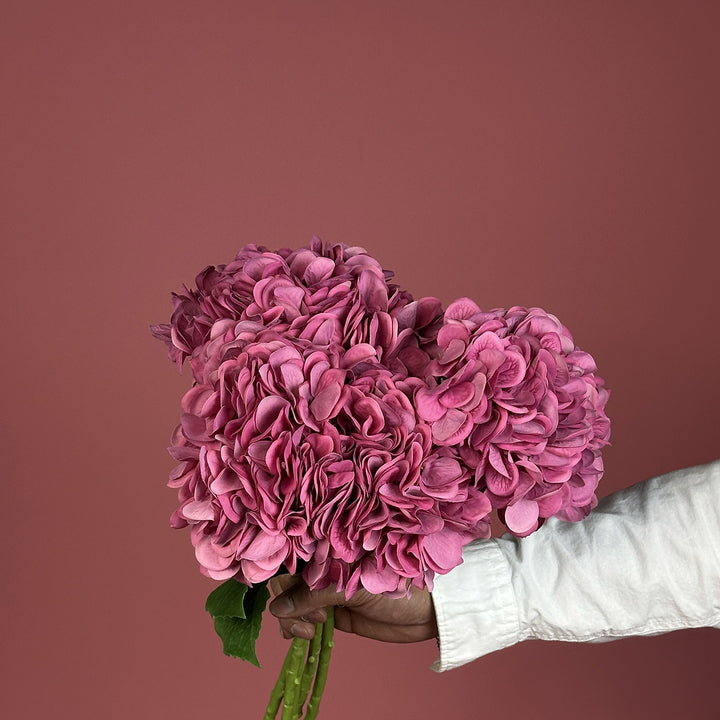 Artificial Real Touch Dark Mauve Hydrangea is a lifelike artificial stem crafted with pillowy, real-touch petals in rich deep mauve, fading softly toward creamy tips. A realistic green calyx and fine veining add botanical depth, while the flexible wired stem lets you fan airy arches or tuck compact clusters effortlessly into any design.