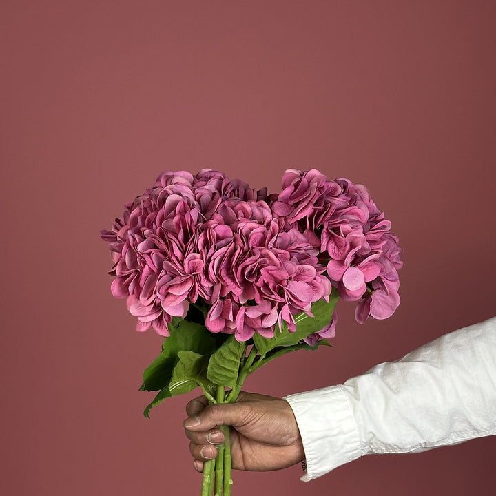 Artificial Real Touch Dark Mauve Hydrangea is a lifelike artificial stem crafted with pillowy, real-touch petals in rich deep mauve, fading softly toward creamy tips. A realistic green calyx and fine veining add botanical depth, while the flexible wired stem...