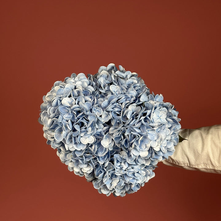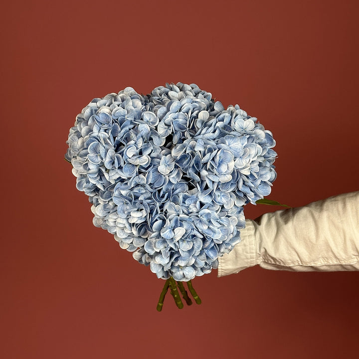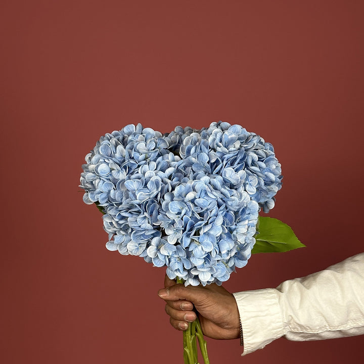 Artificial Real Touch Light Blue Hydrangea is a lifelike artificial stem crafted with pillowy, real‑touch petals that display delicate gradients of sky‑blue fading toward creamy tips, mirroring a freshly snipped hydrangea. A realistic green calyx and subtle veining add botanical depth, while the flexible wired stem lets you shape airy arcs or compact clusters with ease.