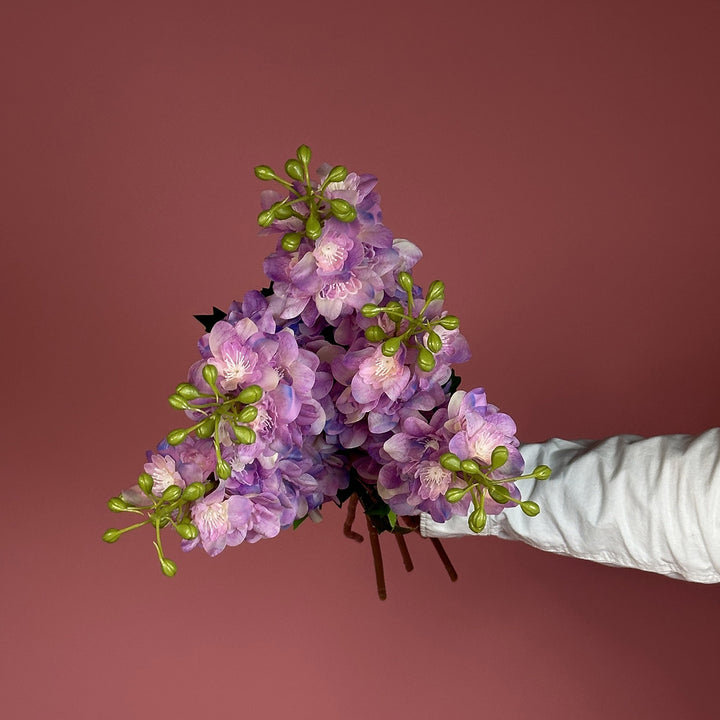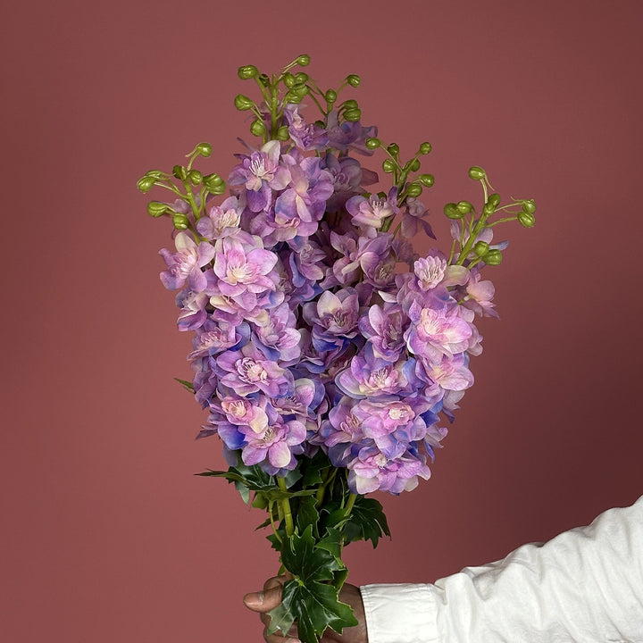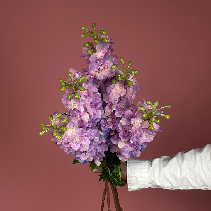 Artificial Real Touch Lilac Delphinium is a lifelike artificial stem sculpted with tall spires of real‑touch petals in soft lavender and pale violet, echoing the dreamy pastels of a woodland meadow. Each bloom features delicate shading and natural veining, while the flexible wired stem lets you arch graceful curves or shape upright columns with ease.