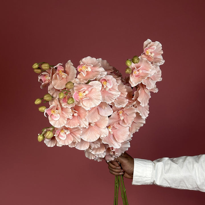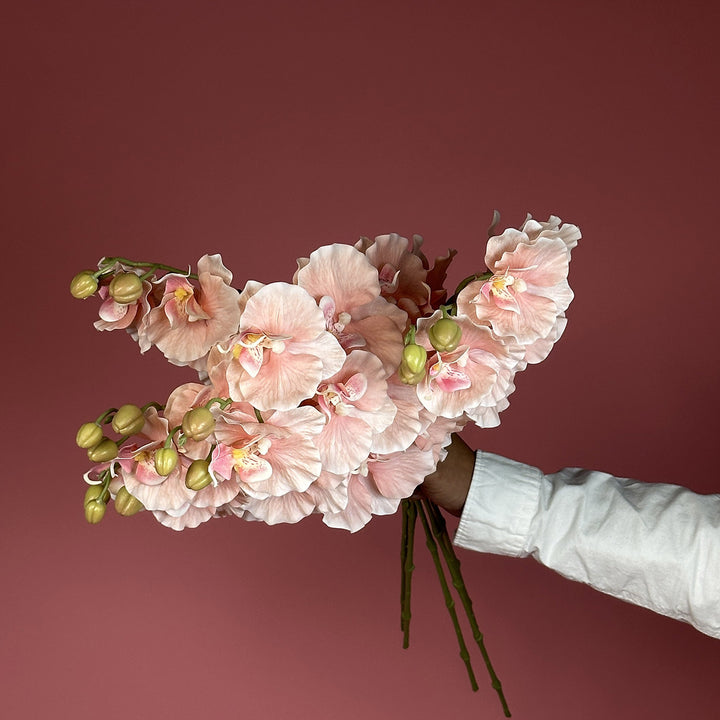 Real Touch Phalaenopsis C5 Light Pink is a lifelike artificial stem sculpted with velvety petals in soft blush tones, fading gently to creamy highlights. Each bloom features a natural lip and delicate speckles, while the flexible wired stem allows you to curve graceful cascades or tuck compact sprays into any design.