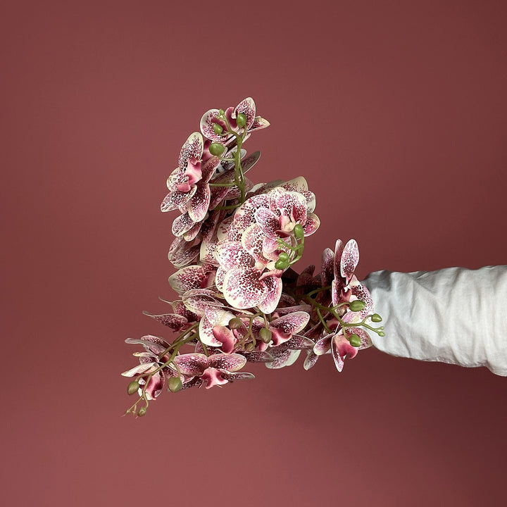 Real Touch Orchid C4 White & Pink Speckles is a lifelike artificial stem sculpted with velvety petals that are crisp white with delicate blush-pink dots. Each bloom features a lifelike lip and subtle veining, while the flexible wired stem lets you curve graceful cascades or tuck compact sprays into any arrangement.