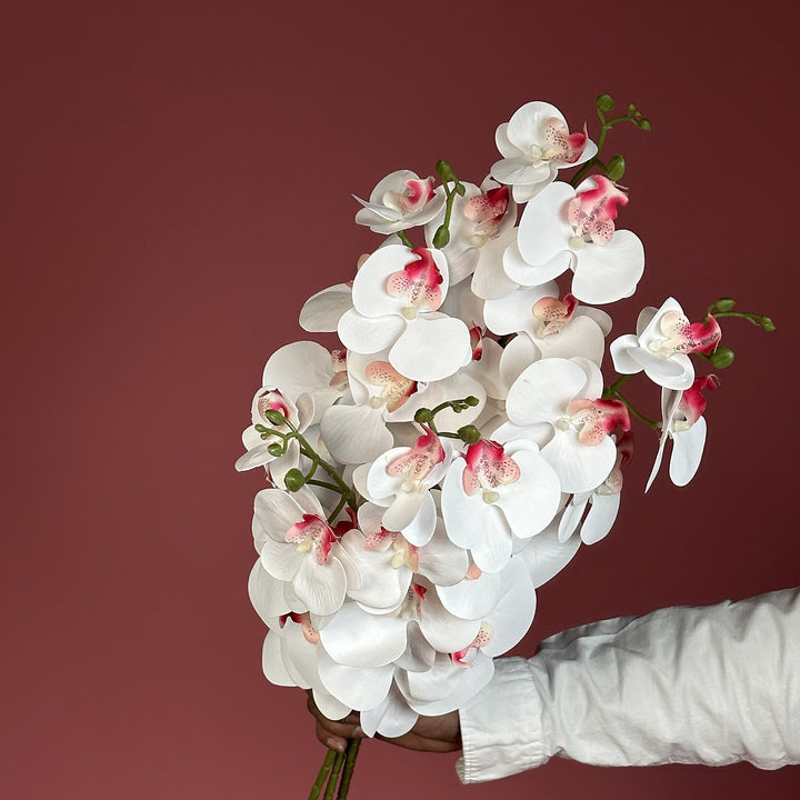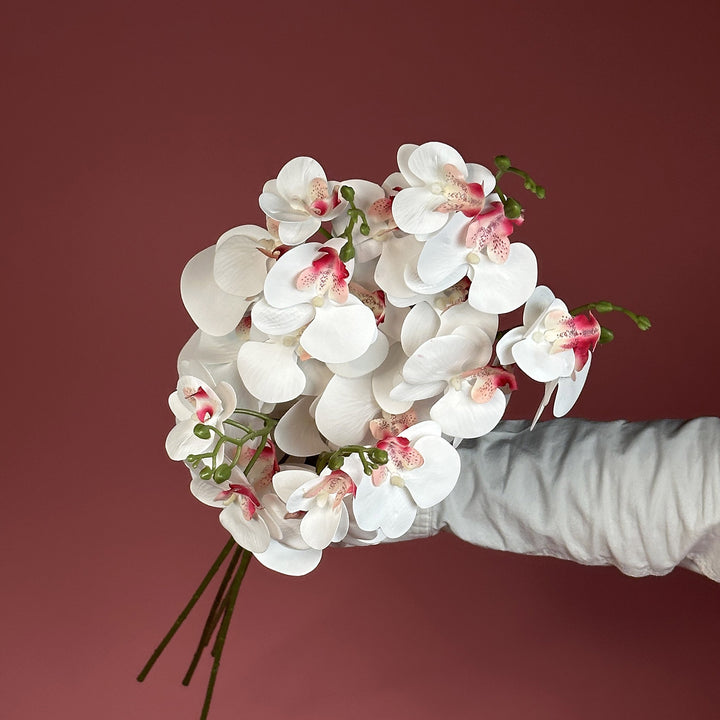 Artificial Real Touch White Orchid is a lifelike artificial stem sculpted with velvety petals in soft blush tones, fading gently to creamy white at the edges. Each bloom features natural speckles and a realistic lip, while the flexible wired stem lets you curve graceful cascades or shape compact clusters with ease.