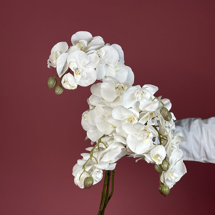 Artificial Real Touch White Phalaenopsis is a lifelike artificial stem sculpted with velvety petals in pure snow‑white, featuring subtle veining and a lifelike lip that echoes a freshly cut orchid. The flexible wired stem lets you shape graceful cascades or tuck compact sprays into any arrangement, adding classic elegance without the upkeep.