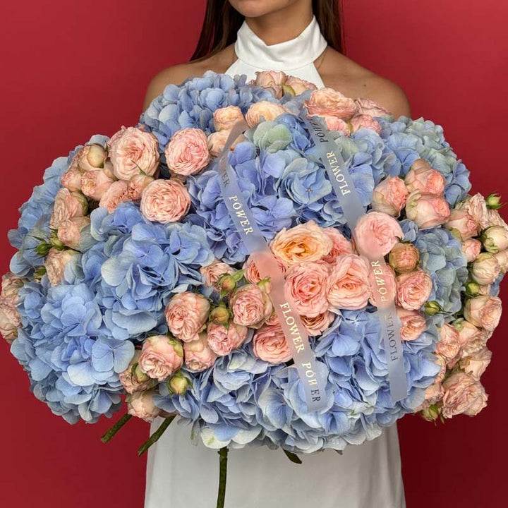 The rich blue hydrangeas add depth and sophistication, while clusters of petite peach roses infuse the bouquet with gentle contrast and tenderness. Together, they form a harmonious play of color β refreshing yet romantic, ideal for those who appreciate subtle luxury and modern design.