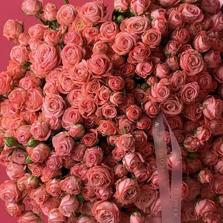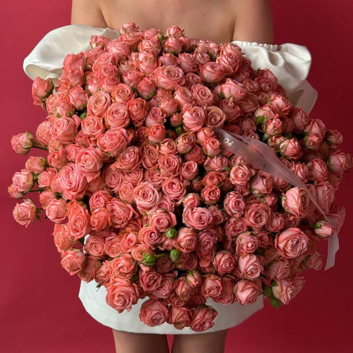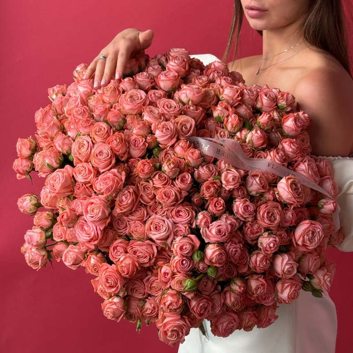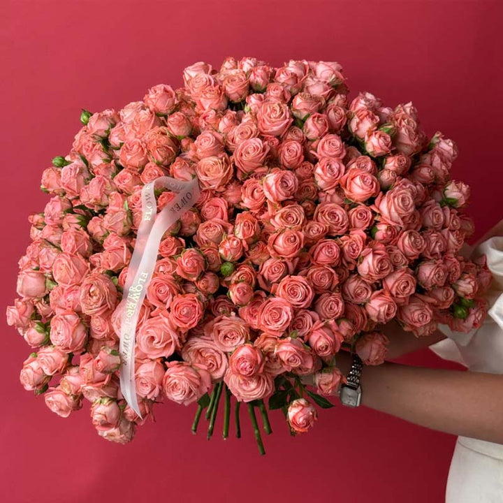 Soft, feminine, and irresistibly charming, Coral Lace is a bouquet that wraps the world in a delicate blush glow. Composed of spray rose stems in refined coral-pink tones, it resembles a cloud of silky petals — plush, romantic, and beautifully textured. The shade feels like a blend of sunset light and couture fabric, echoing the elegance of Dubai’s refined fashion and serene seaside atmosphere.