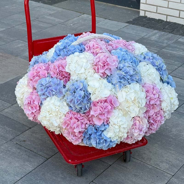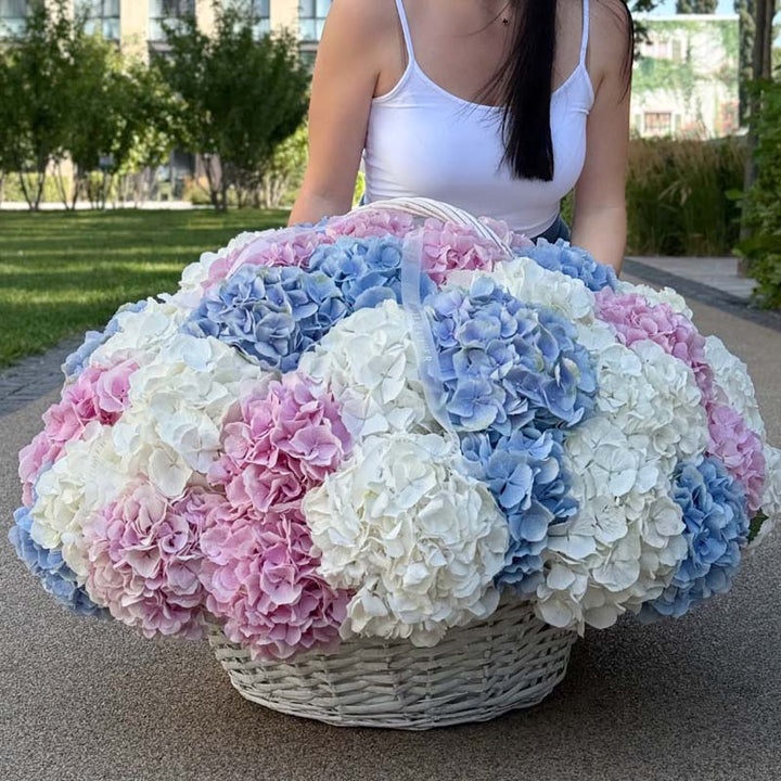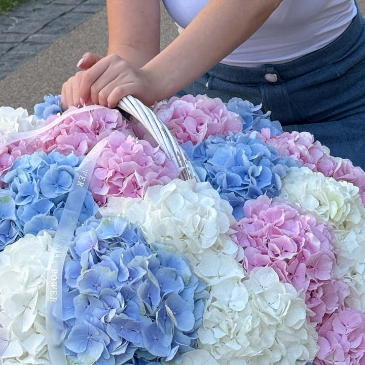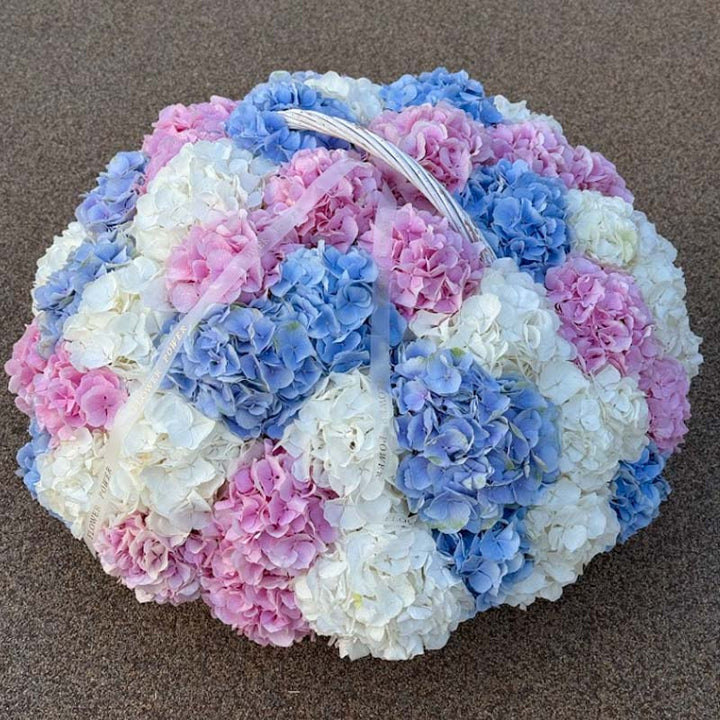 Basket of pink, blue and white hydrangeas Cotton Candy Sky XL