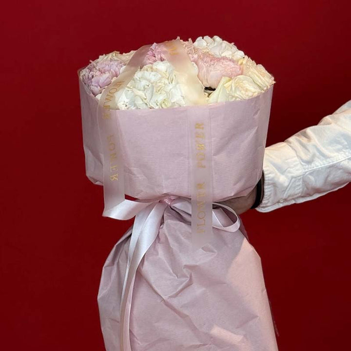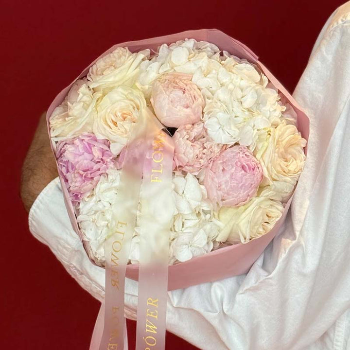 Nude Whisper is a breathtaking symphony of calm elegance β a floral statement that speaks softly yet leaves a lasting impression. This luxurious composition features hydrangeas, peonies, and roses in delicate shades of ivory, champagne, and blush, blending into a perfectly balanced nude palette that radiates understated sophistication.