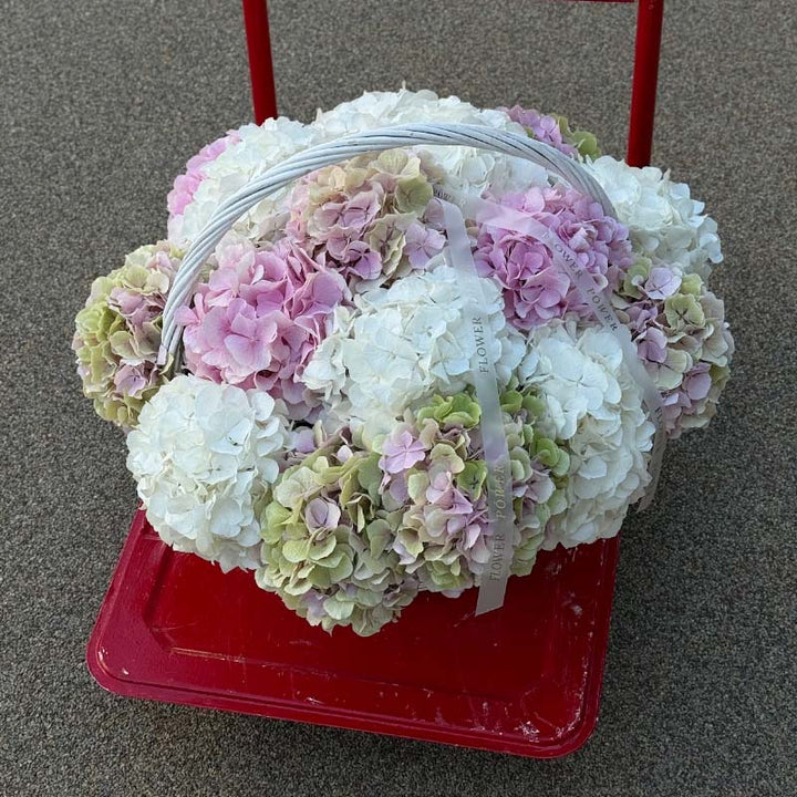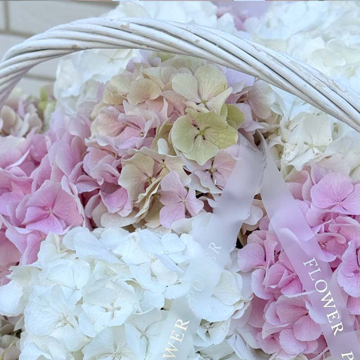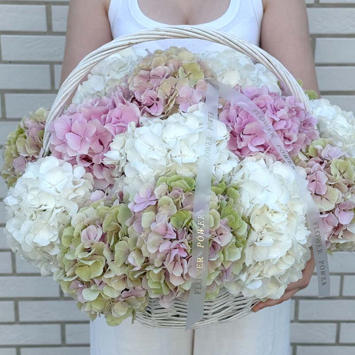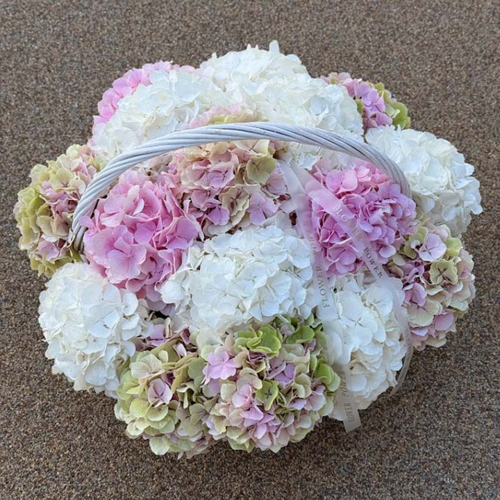Basket of pink, white and light green hydrangeas Pastel Meadow S