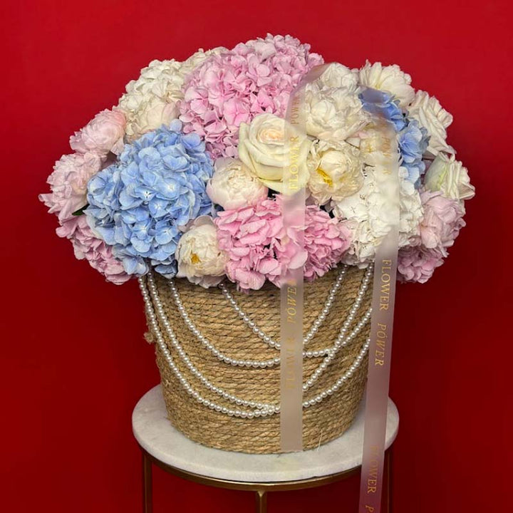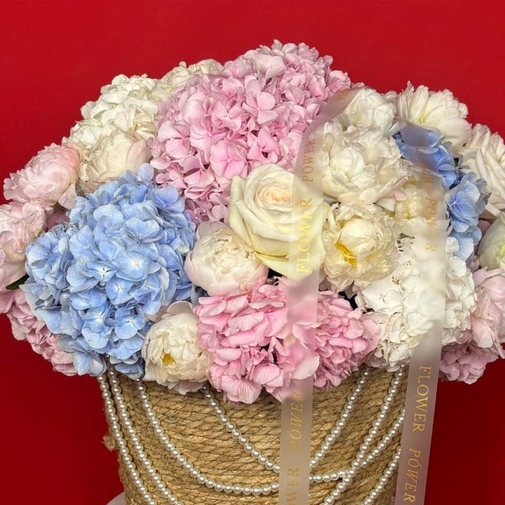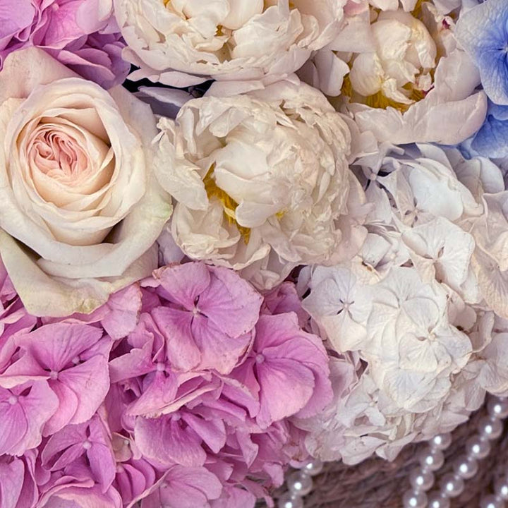 Basket of hydrangeas, peonies and roses Pastel Reverie