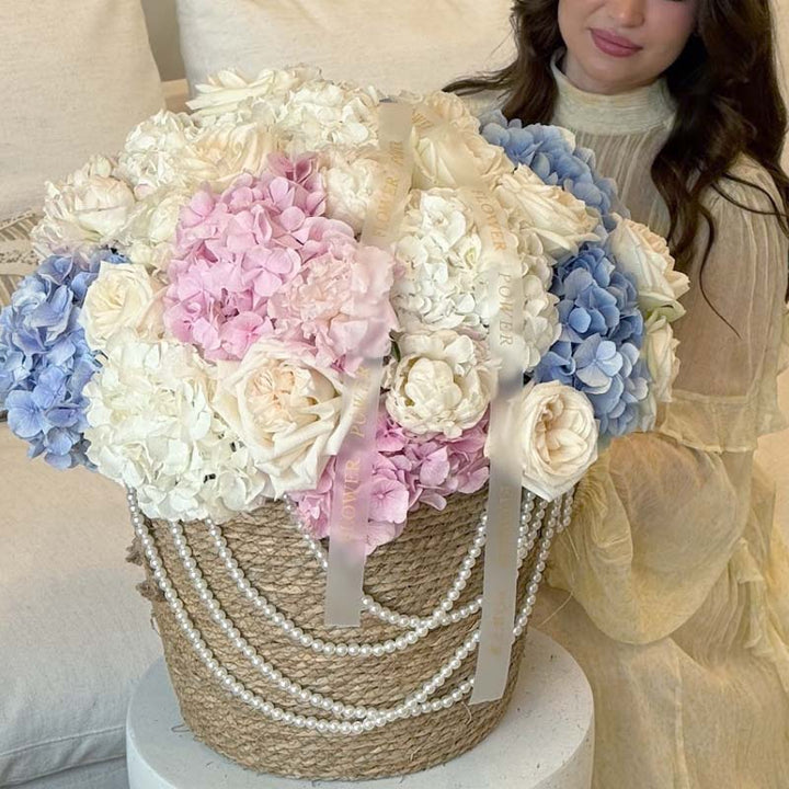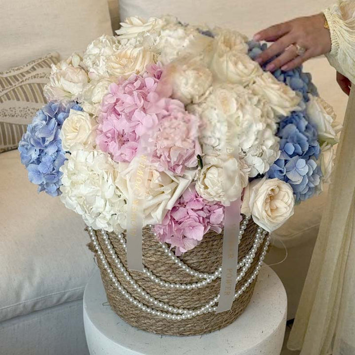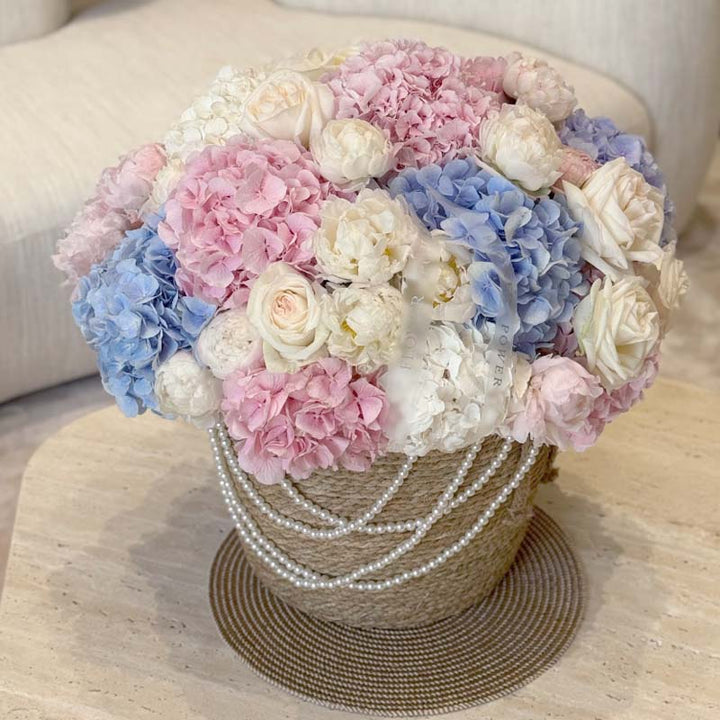 Each bloom is carefully placed to create volume and harmony, resulting in a composition that feels light yet majestic. Set in a handcrafted natural basket adorned with cascading pearl strands, Pastel Reverie embodies sophisticated coastal chic — a signature of modern Dubai living.