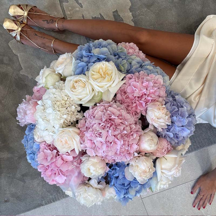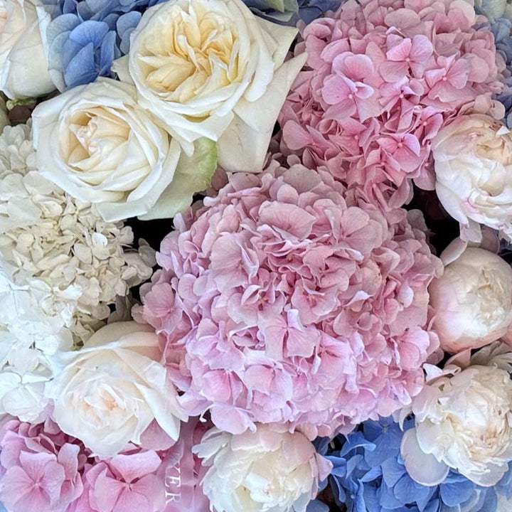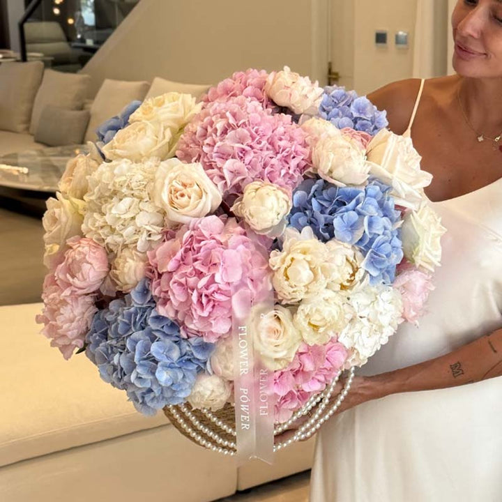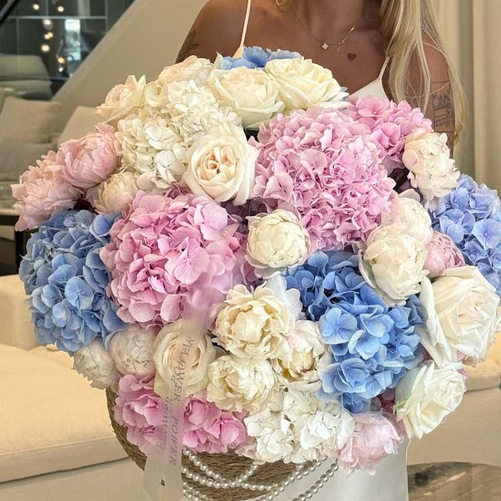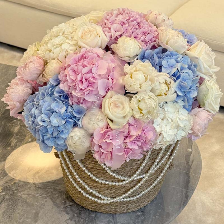 A vision of dreamy elegance, Pastel Reverie is where art and serenity meet. This luxurious arrangement combines delicate hydrangeas, lush peonies, and romantic roses in a palette of soft pink, powder blue, ivory, and cream — capturing the tranquil beauty of a Dubai sunrise reflected on calm waters.