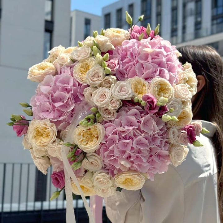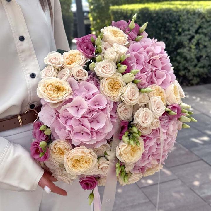Discover the elegance of our Pastel Symphony bouquet – a luxurious floral arrangement crafted from cream garden roses, soft pink hydrangeas, lisianthus, and spray roses. Designed for those seeking a romantic bouquet or a flower gift for her, this soft color palette evokes grace and timeless beauty. Perfect as an anniversary bouquet, birthday flowers, or congratulatory blooms, it’s a harmonious blend of blush, ivory, and pastel lavender. Whether you're searching for luxury flower delivery in Dubai or elegant pink flower bouquets, this stunning arrangement speaks the language of love and celebration.