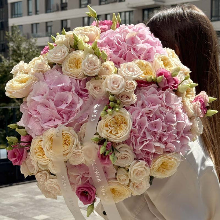 Discover the elegance of our Pastel Symphony bouquet – a luxurious floral arrangement crafted from cream garden roses, soft pink hydrangeas, lisianthus, and spray roses. Designed for those seeking a romantic bouquet or a flower gift for her, this soft...