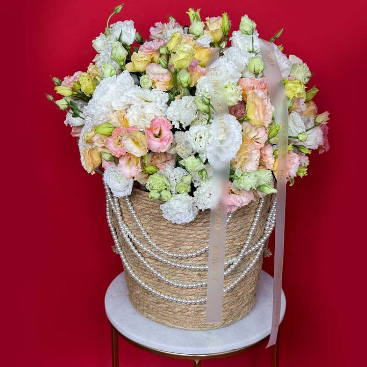 Each petal looks like it’s kissed by morning light — light, ruffled, and beautifully layered. The flowers are nestled in a natural woven basket, draped with elegant strands of pearls, adding an unmistakable touch of chic coastal glamour that resonates perfectly with Dubai’s contemporary style.