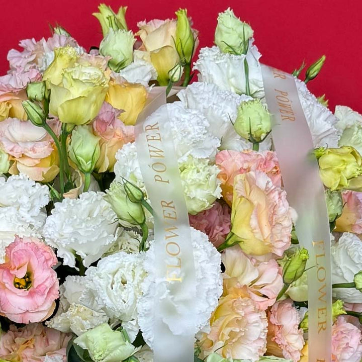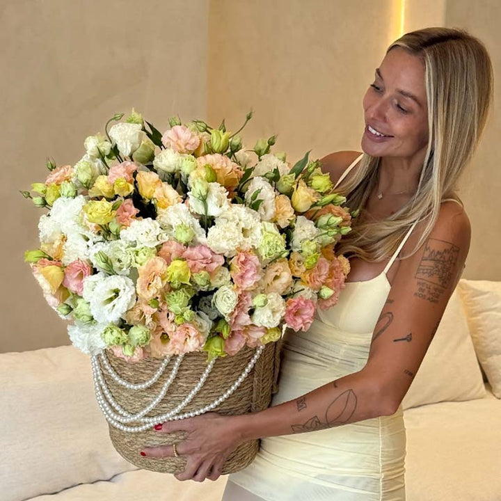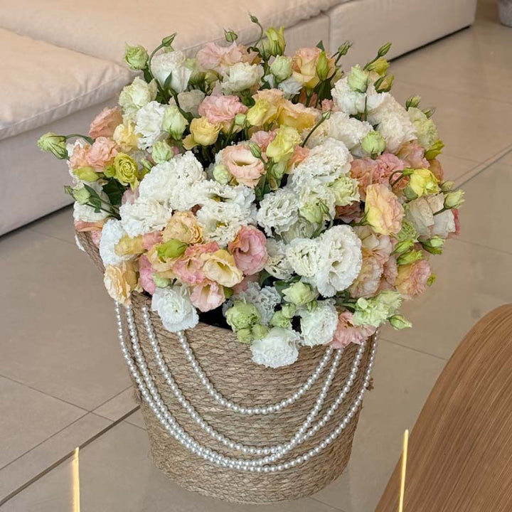 Soft, airy, and exquisitely graceful — Pastel Whisper is the definition of modern floral luxury. Designed for Dubai’s refined spaces and sunlit interiors, this voluminous arrangement of fresh eustoma blooms radiates sophistication through its gentle mix of cream, blush, peach, and soft green tones.