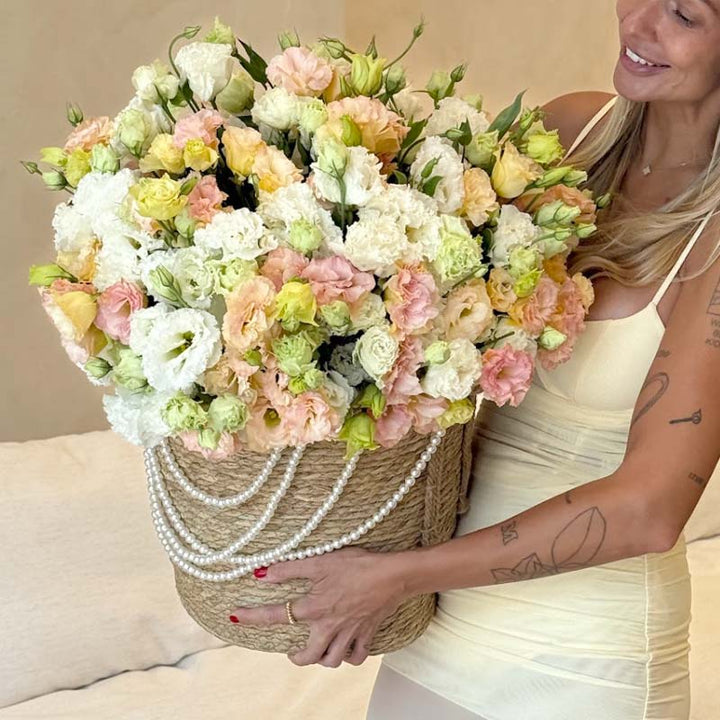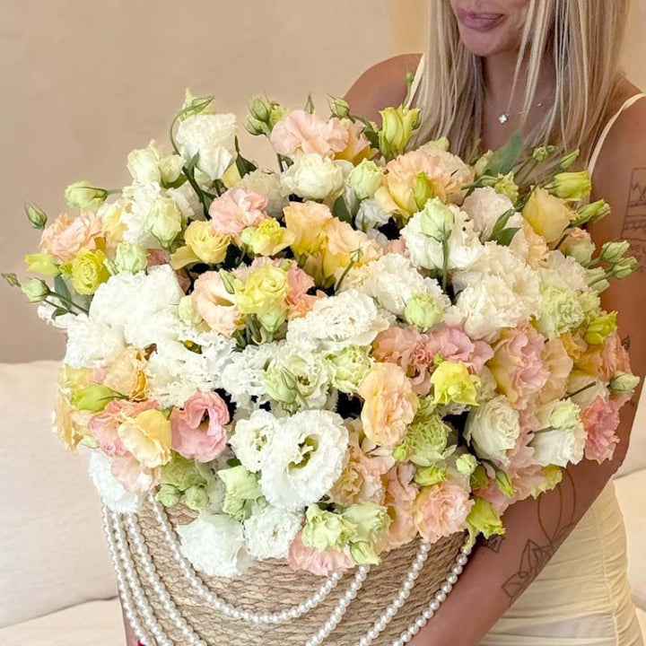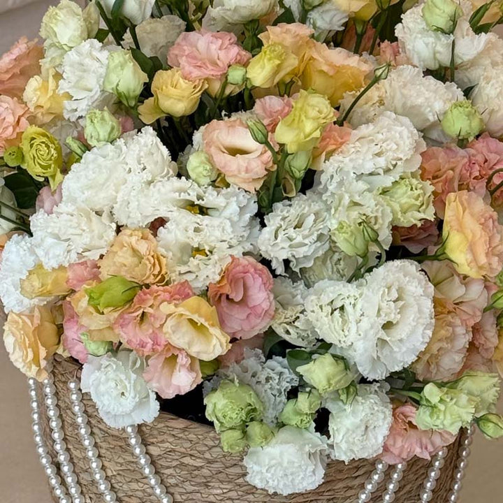 Basket of cream, blush, peach, and soft green eustomas Pastel Whisper