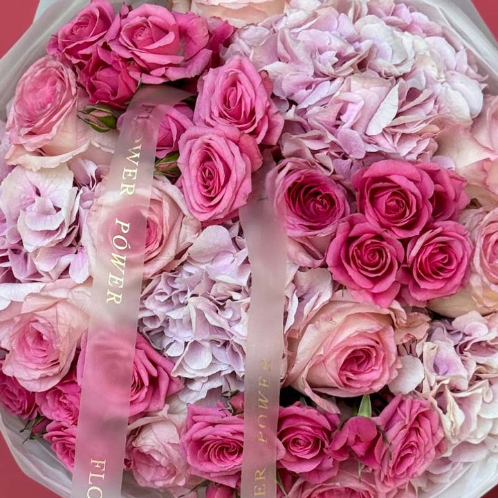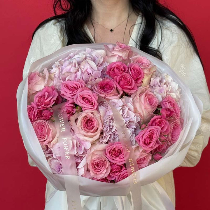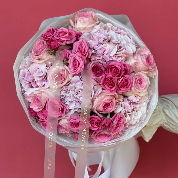 Delight in the soft charm of our Peony Sorbet bouquet — a handcrafted floral arrangement combining powder pink hydrangeas and luscious garden roses in ombre tones of light pink to deep fuchsia. This stunning bouquet blends seasonal premium roses and...